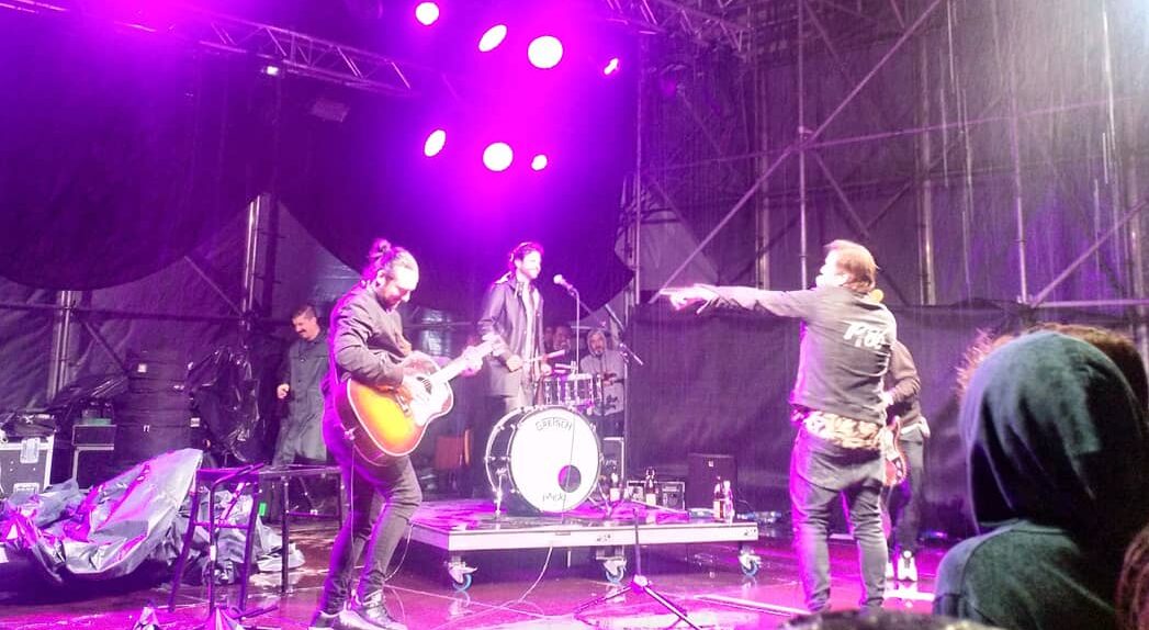 So etwas haben auch langjährige Konzertbegleiter noch nicht erlebt… Das Rock the Wolves-Konzert war zu Ende bevor es richtig begonnen hatte, durch die miserablen Wetterbedingungen. Um die doch relativ zahlreich angereisten wetterfesten Fans nicht zu enttäuschen, lud der mittlerweile auch nasse Baschi zur improvisierten Bühnenparty mit ein paar unplugged Songs. „Rampensau“ lässt grüssen! Ein Teil der Band war selbst mit dem Handy unterwegs, weil auch sie so eine Situation wohl noch selten erlebt haben.